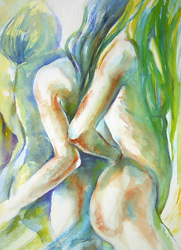 Aquarel Naakt Vrouw Groen Blauw Geel