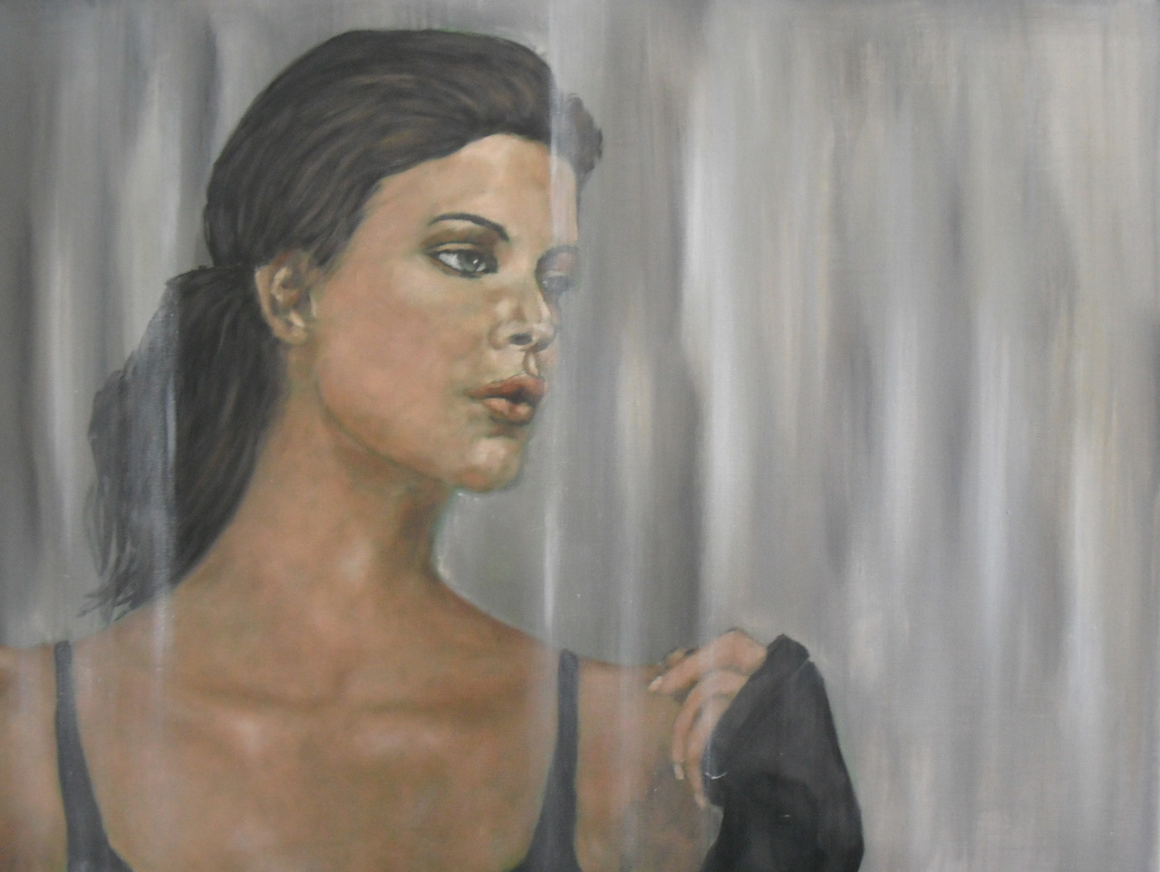 Sophia geportretteerd achter het glasgordijn.