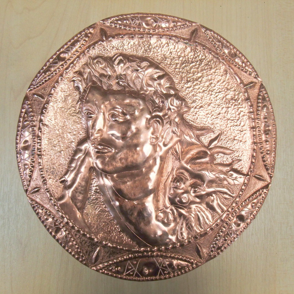 Dit wandbord heb ik geciseleerd uit 1 mm dik roodkoperplaat. De voorstelling is geïnspireerd op de Romeinse beeldhouwkunst.