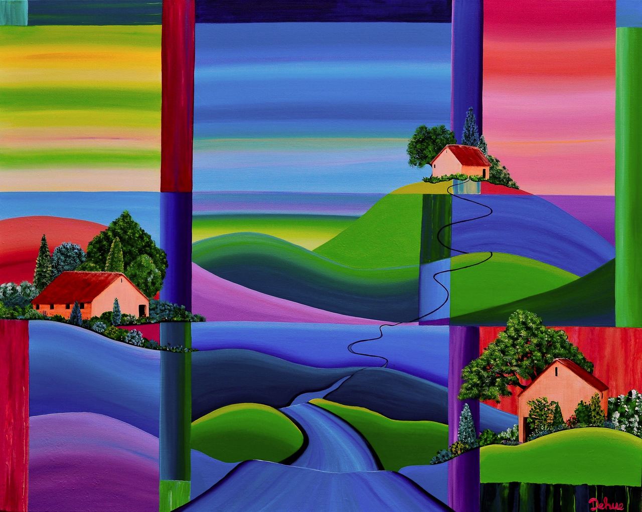 Rood Geel Landschap Blauw Paars Groen Helder Kleurrijk Frankrijk Bergen Bomen Roze Vrolijk Landscape Lila Weg Uitzicht Frans Huizen Sfeervol Horizon Roodbruin Lichtval Fantasy Heuvels