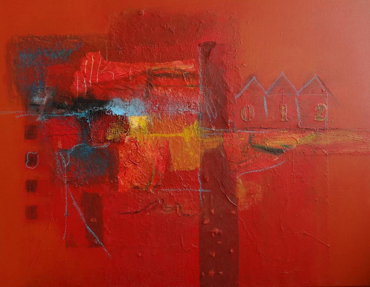 Rood Acryl Krijt Olieverf Doek Materie Collage Stad Huizen