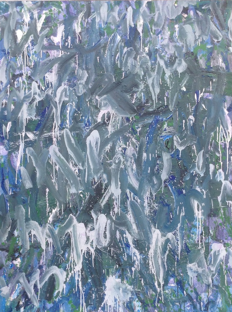 Witte druipende strepen over een ondergrond van dikke groene en blauwe verf