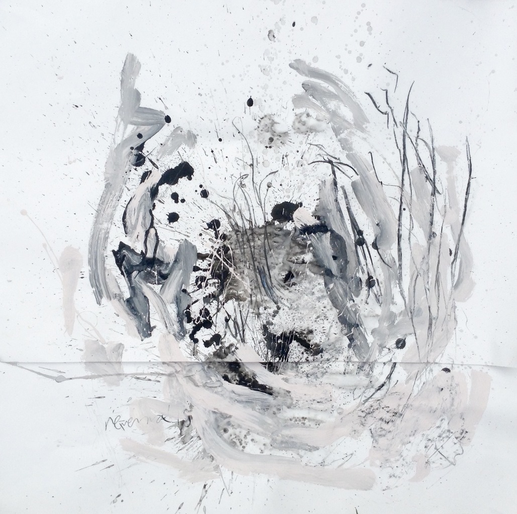 Ruwe houtskoolstrepen samen met zachtroze/wit vegen acryl/latex en vlekken inkt