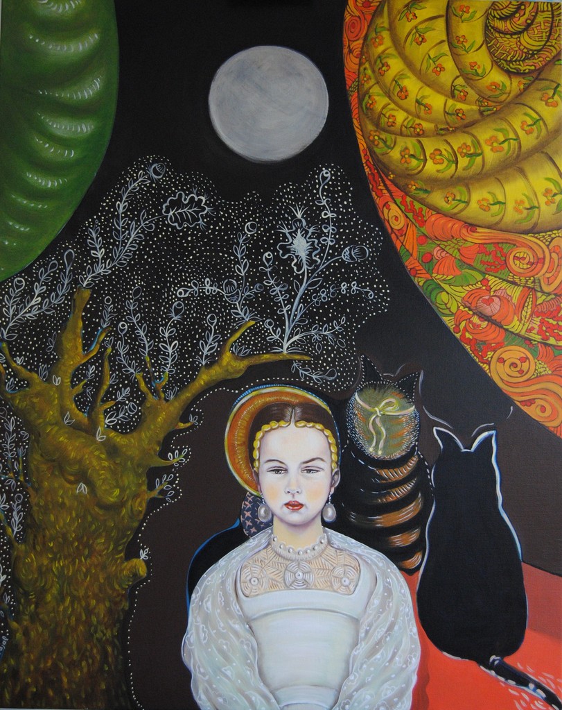 Bloesem Blossom Meisje Girl Boom Tree Curtains Gordijn Katten Cats Kleurrijk Colourful Nacht Night Maan Moon