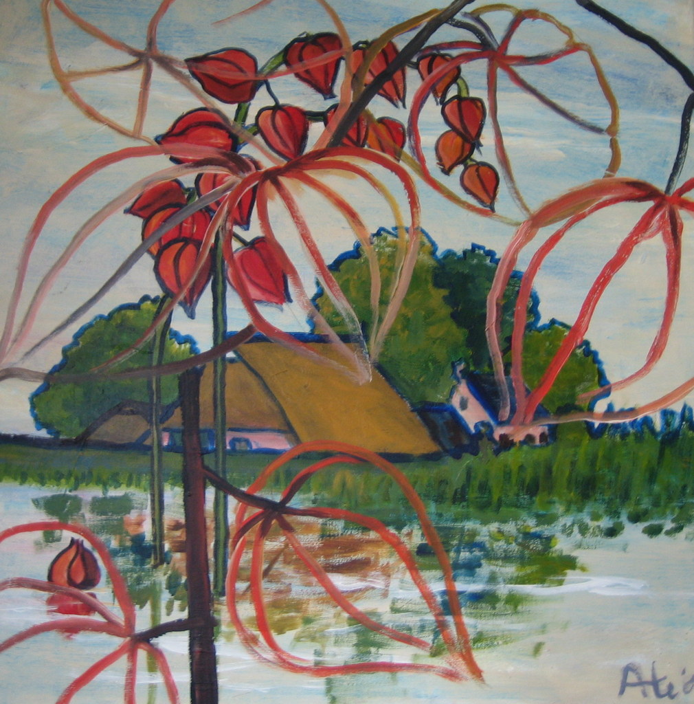 Een boerderij aan het water lampionplanten ervoor....er overheen.....