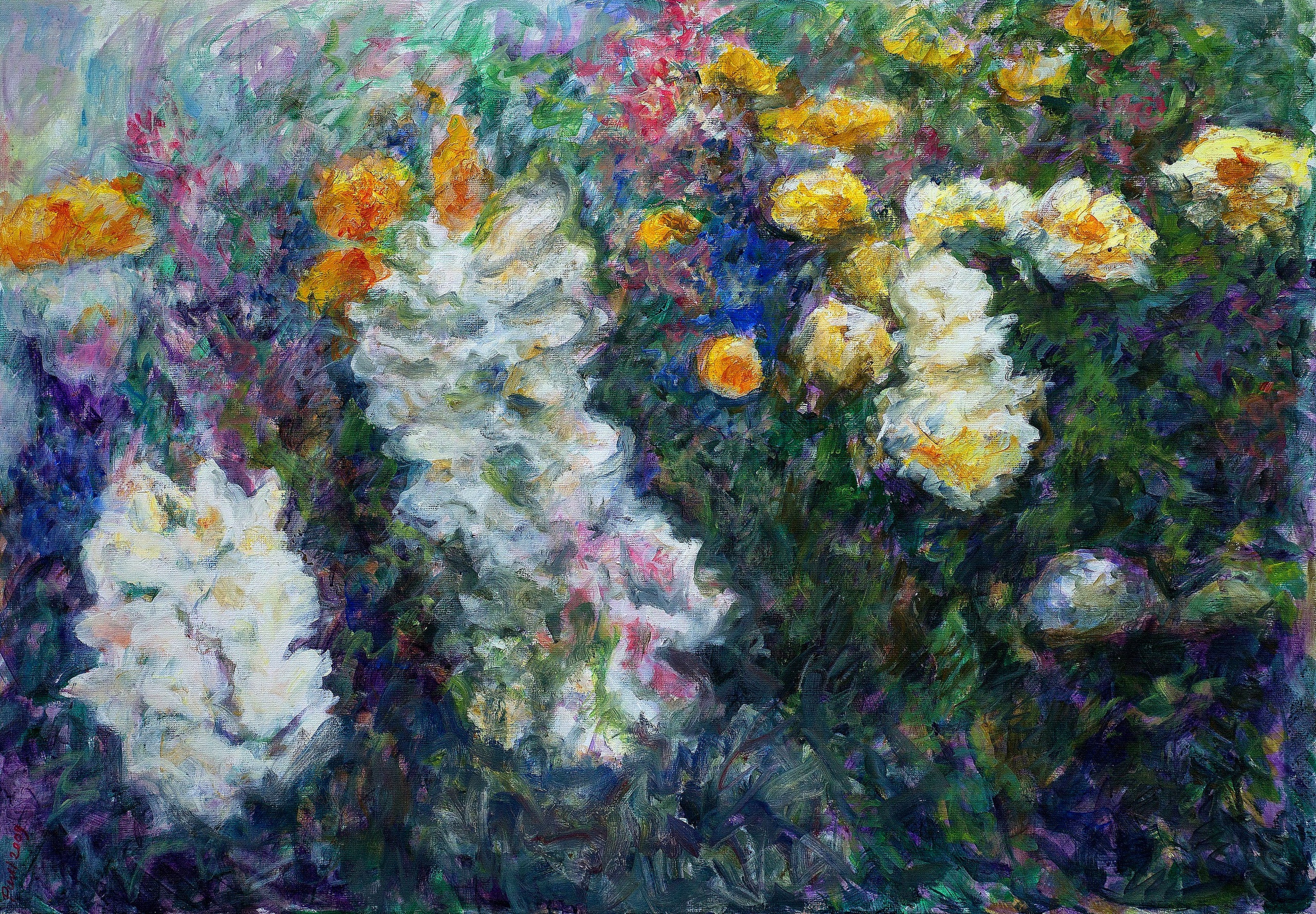 Zomer bloemen in juni, expressief geschilderd. Deel 1 van tweeluik. kleurig, uitbundig, penseelstreken met gevoel