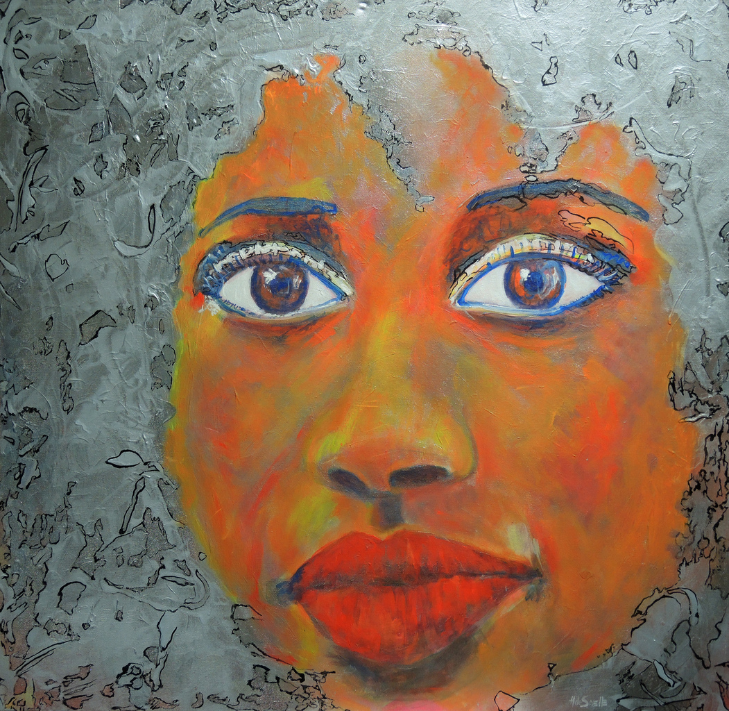 Experiment met zilverkleurige verf. De oplettende bezoeker zal opvallen dat er een gelijkend portret binnen de serie portretten aanwezig is met krulletjes. Het betreft hetzelfde werk echter met een nieuwe haardracht in zilver. Aan u ter beoordeling of het werk er op vooruit is gegaan?