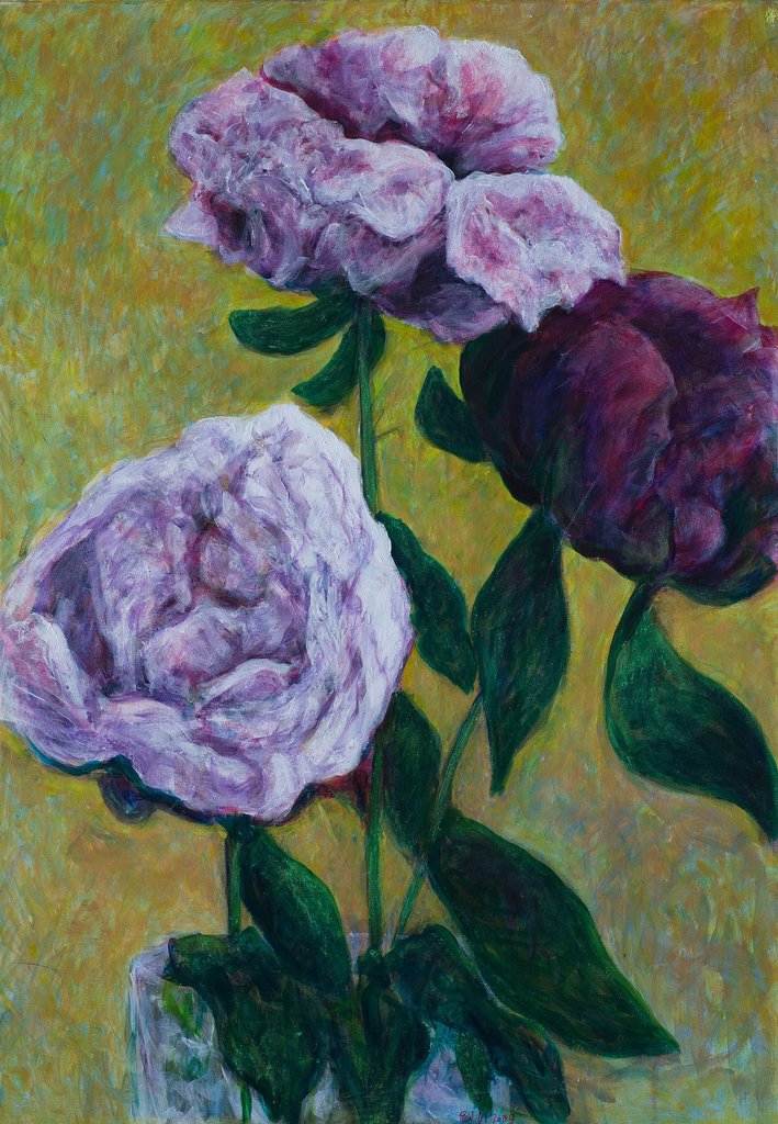 Pioenrozen in de middag. Deel 2 (serie van 3) Schilderij met impressionistische verf streken geschilderd.