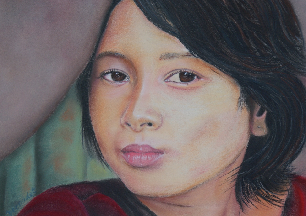 Meisje Kind Portret Krijt Gezicht Ogen Tekening Pastel Bruine Hoofd Haar Haren Uitdrukking Kyra Cambodjaanse