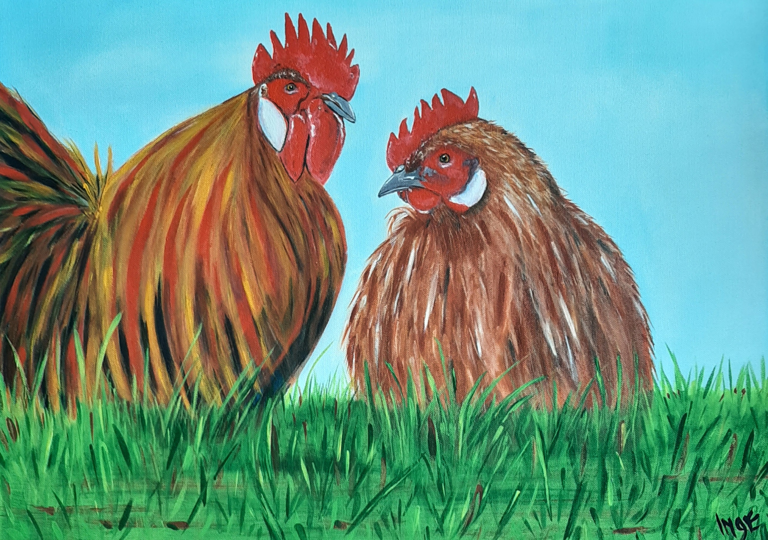 Mooie haan en kip handgeschilderd in warme acryl tinten op canvas