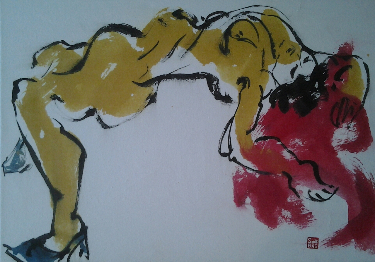 Sook Bae(1959)is in 1980 afgestudeerd aan de young nam college(Toegepast kunsten) in zuid-korea In 1996 volgde zij modeltekenen aan de Grand Academie te parijs Sins 1997 woont ze in Amsterdam. "ik teken en schilder direct naar model Het onderwerp dat my blijvend inspireert is de mens; poserend of bezig met alledaagse dingen, De techniek van het tekenen is sumi-e is mijn grote Liefde. Als ik goed bezig ben, werken mijn ogen en handen Samen en is mijn hoofd leeg; het voelt als een Meditatie"