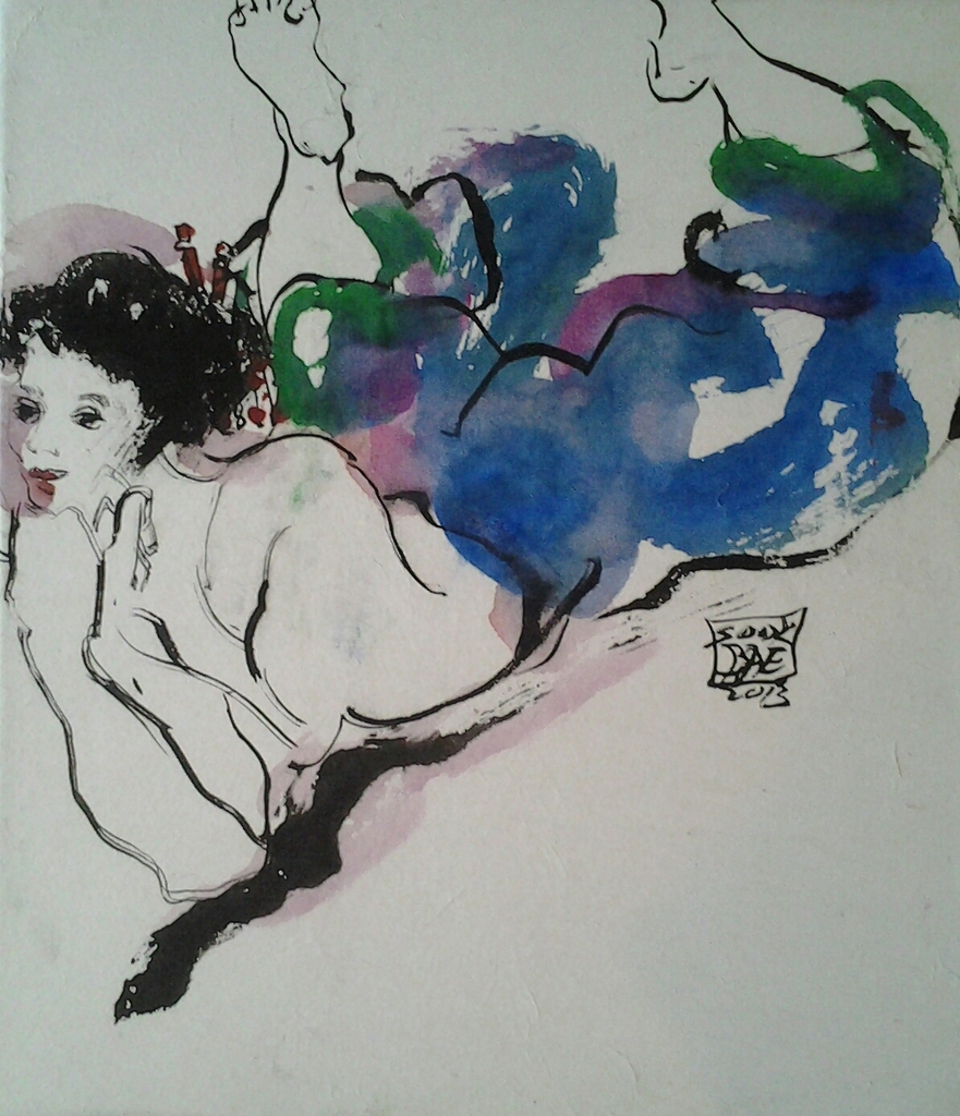 Sook Bae(1959)is in 1980 afgestudeerd aan de young nam college(Toegepast kunsten) in zuid-korea In 1996 volgde zij modeltekenen aan de Grand Academie te parijs Sins 1997 woont ze in Amsterdam. "ik teken en schilder direct naar model Het onderwerp dat my blijvend inspireert is de mens; poserend of bezig met alledaagse dingen, De techniek van het tekenen is sumi-e is mijn grote Liefde. Als ik goed bezig ben, werken mijn ogen en handen Samen en is mijn hoofd leeg; het voelt als een Meditatie"