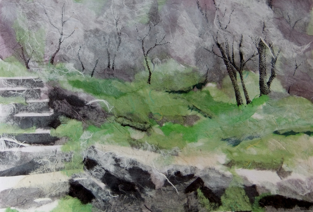 Maakt voornamelijk landschapselementen met voornamelijk bomen als thema en inkt en kleurpapier