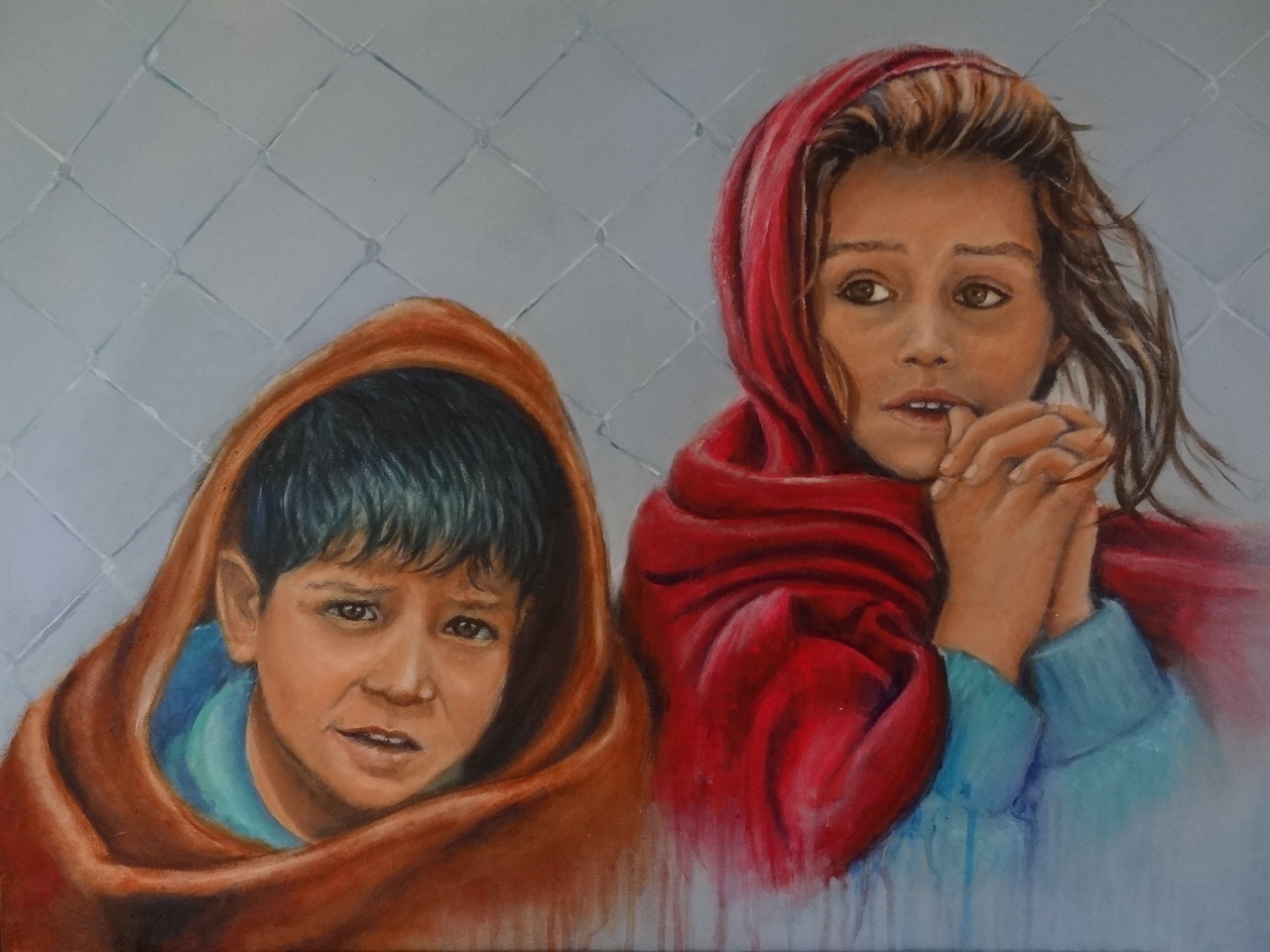 Kind op de vlucht voor mensen die haten. bedreigd door een oorlog, ontheemd en verlaten. Waar zijn je vriendjes, je school ? Je bent bang. Je wordt opgejaagd, je toekomst ontnomen. Waar is een plek waar je veilig kunt wonen ? Kind op de vlucht op zoek naar de vrede. (gedeelte uit een gedicht van Hans Cieremans)