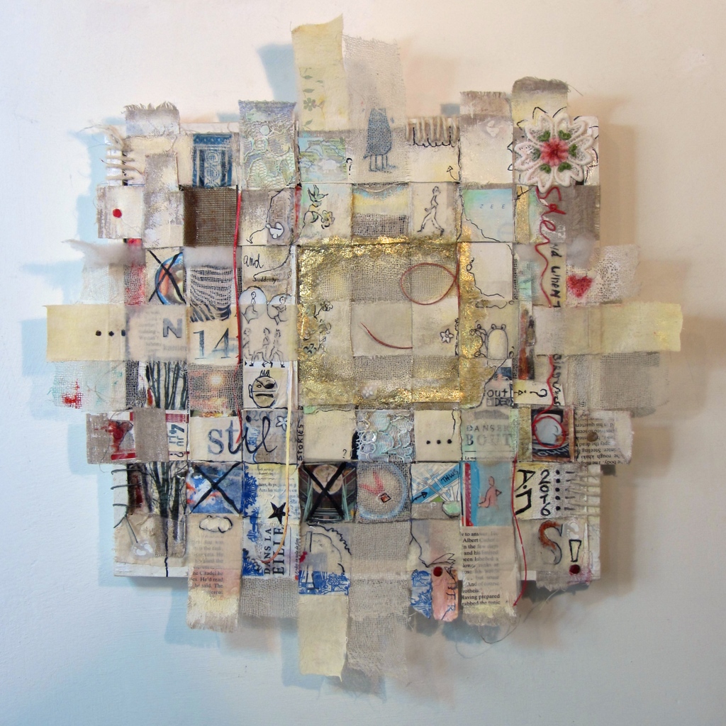 SCHERING & INSLAG. Gedachten vervlochten, verbonden, verwarren, vergeten... Linnen en bewerkte kaasdoek strips gevlochten op open houten frame. Assemblage.