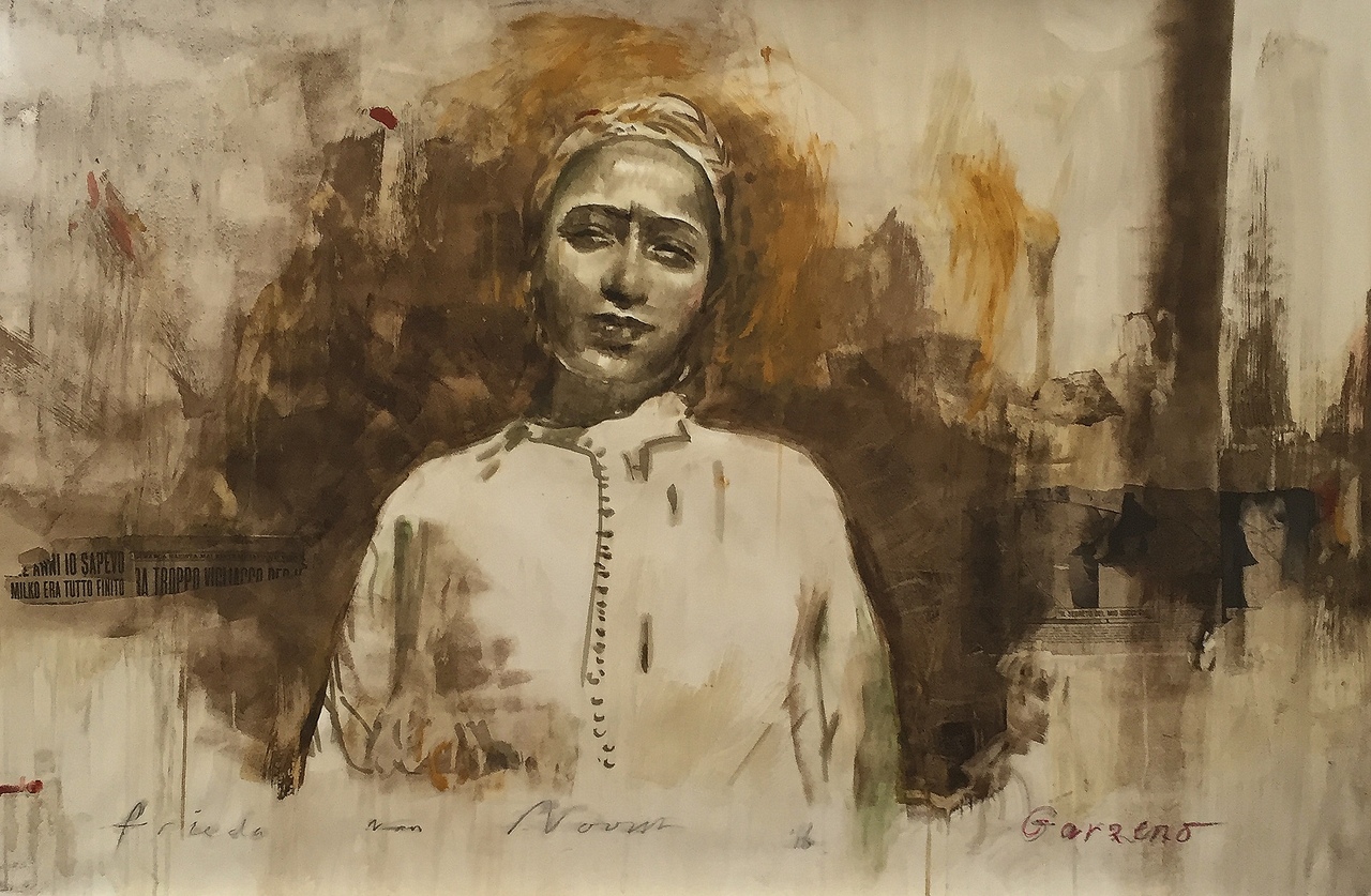 Ik woon en werk in Noord Italie,in het bergdorp Garzeno boven het Como-meer. Mijn schilderijen kenmerken zich door een combinatie van figuratie en abstractie. Grafische elementen, foto's, tekst,collages van stukken krant vormen een essentieel onderdeel van de totale compositie.