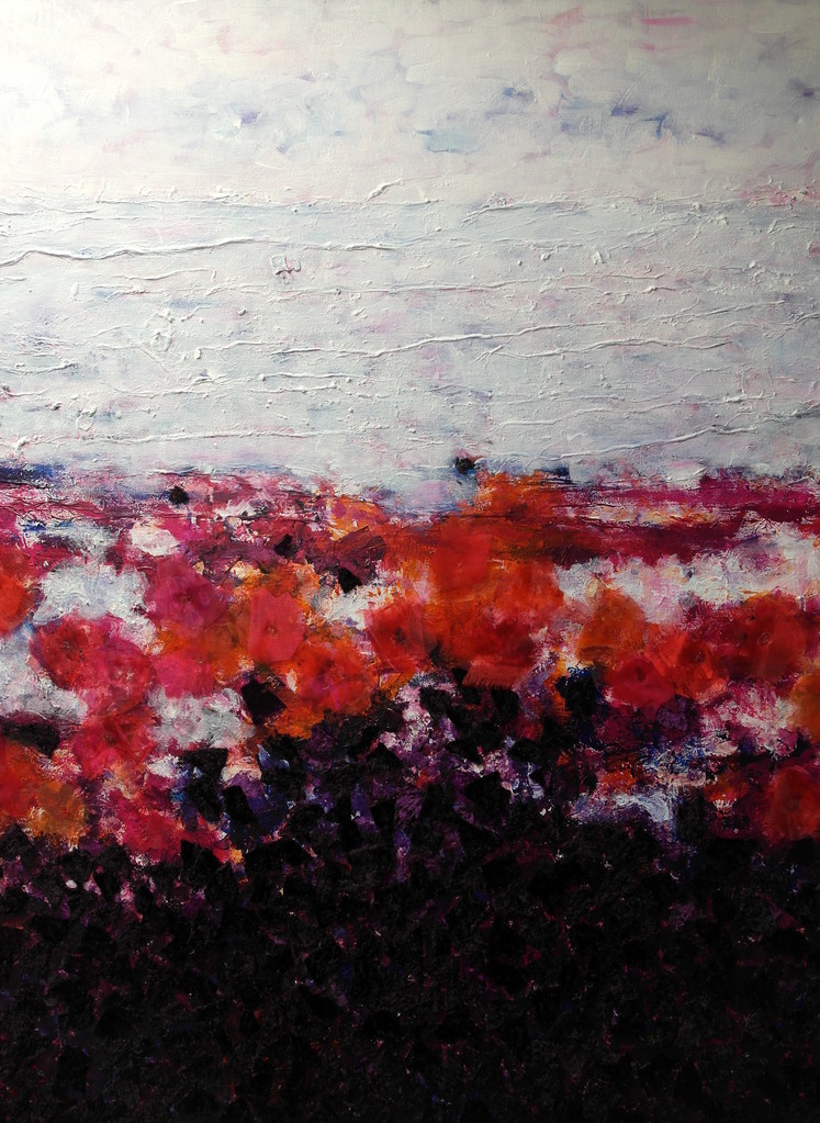 Tijdens een vakantie op een van de eilanden in het noorden van Nederland werd ze getroffen door het weidse vlakke landschap. Dit soort landschap geeft haar een gevoel van vrijheid. Het was een inspiratie om in dit thema een aantal schilderijen te maken. De eenvoud van het onderwerp gaf haar de mogelijkheid om te experimenteren met verschillende materialen. Hierdoor heeft elk schilderij een andere unieke sfeer. Voor dit werk gebruikte ze in de collagetechniek stof en acrylverf in paarse, rode, roze en witte tinten. Landscape with flowers door Gita Kalishoek (2016) : Schilderij Acryl, Katoen op Canvas - SINGULART
