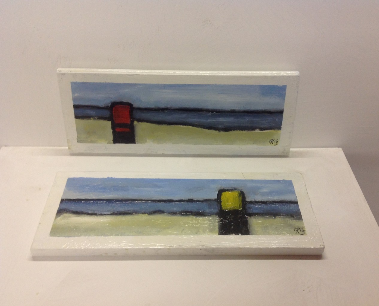 Schilderingen op hout. Getiteld "Houvast". 15 x 40 x 2 cm.