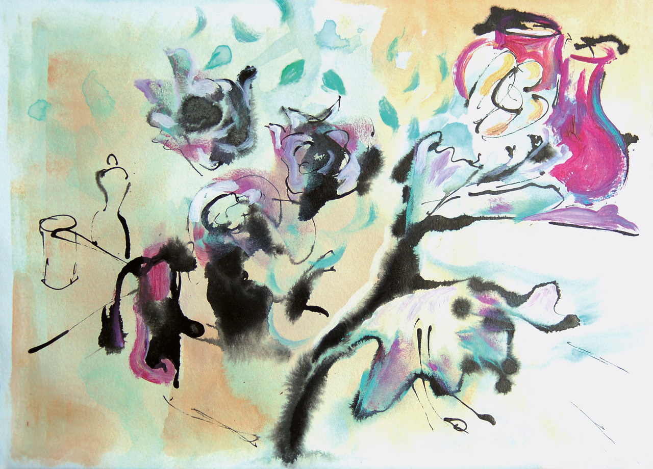 Inkt en acryltekening op papier; geabstraheerde bloemen.