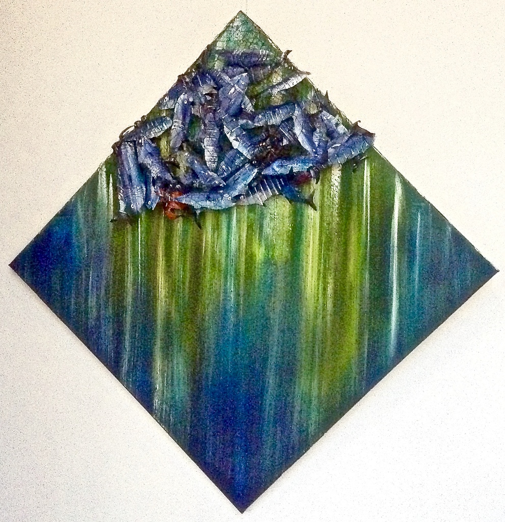 Aanleiding voor dit schilderij is een artikel in een tijdschrift over op grote schaal leeg vissen van de oceanen. Soorten zoals de blauwe tonijn verdwijnen door overbevissing. De soort krijgt geen kans om zich te herstellen omdat ook kleine vissen worden gevangen en verwerkt in de voedingsindustrie. Een oneerlijke strijd tussen de mens en het dier. Materiaal: linnen doek op houten frame, acryl verf, vernis, visnet, petflessen. Afmeting 95 x 95 cm.