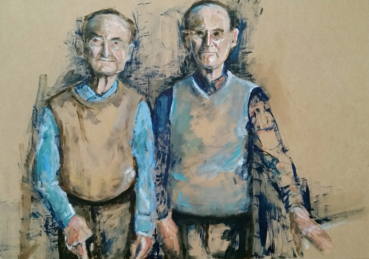 Naar werkwijze van Sam Drukker dit dubbelportret op gekleurde ondergrond. Bron: foto van Gea Schenk in Volkskrant Magazine van 29 november 2014, over de tweelingbroers Poppo en Engel. Ingelijst.