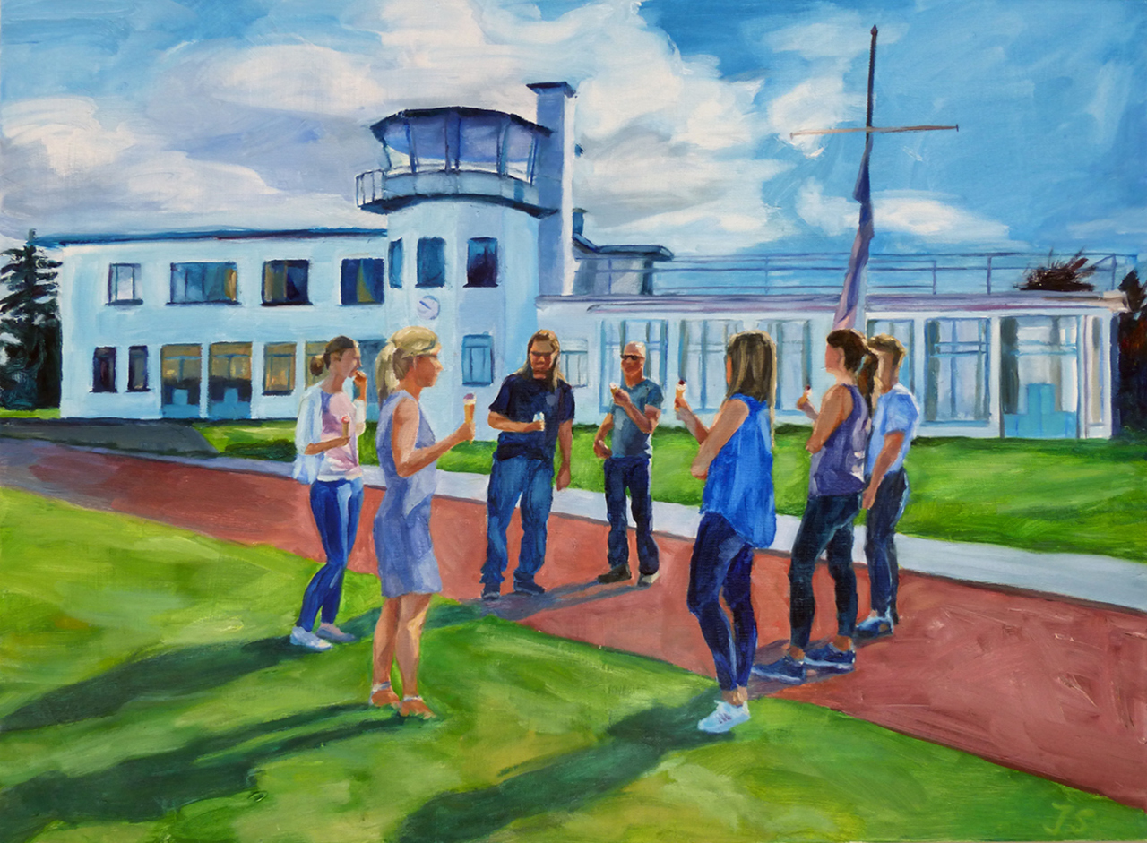 Dit schilderij heb ik in januari 2016 gemaakt bij het afscheid van Bed & Breakfast Europe, waar ik vijf jaar heb gewerkt. Je ziet mijn oud-collega’s met op de achtergrond het kantoorpand, het voormalige Luchthavengebouw van vliegveld Welschap in Meerhoven. Het schilderij is een bedankje voor vijf prachtige jaren.