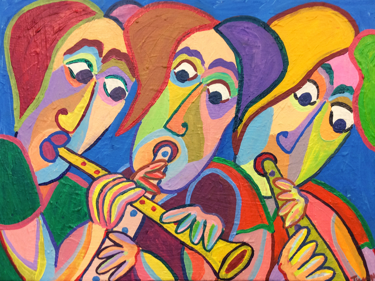 Schilderij Acryl Kunst Kleur Kubisme Kubistisch Muziek Humor Plezier Trio Klarinet Trompet Blazers Band Ensemble Jazz Painting Acrylic Art Color Cubism Cubist Music Fun Clarinet