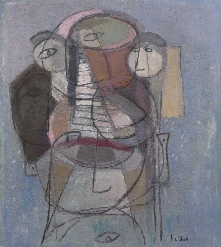 Je bent nooit alleen. Mensen interesseren mij. Het zoeken naar het abstracte. Het spel van vlakken en lijnen. Het zoeken naar de juiste compositie, mijn eigen wereld, mijn eigen beeldtaal. In dit schilderij zie je vele hoofden. Hoofden die steeds meer op maskers gaan lijken. Totem?