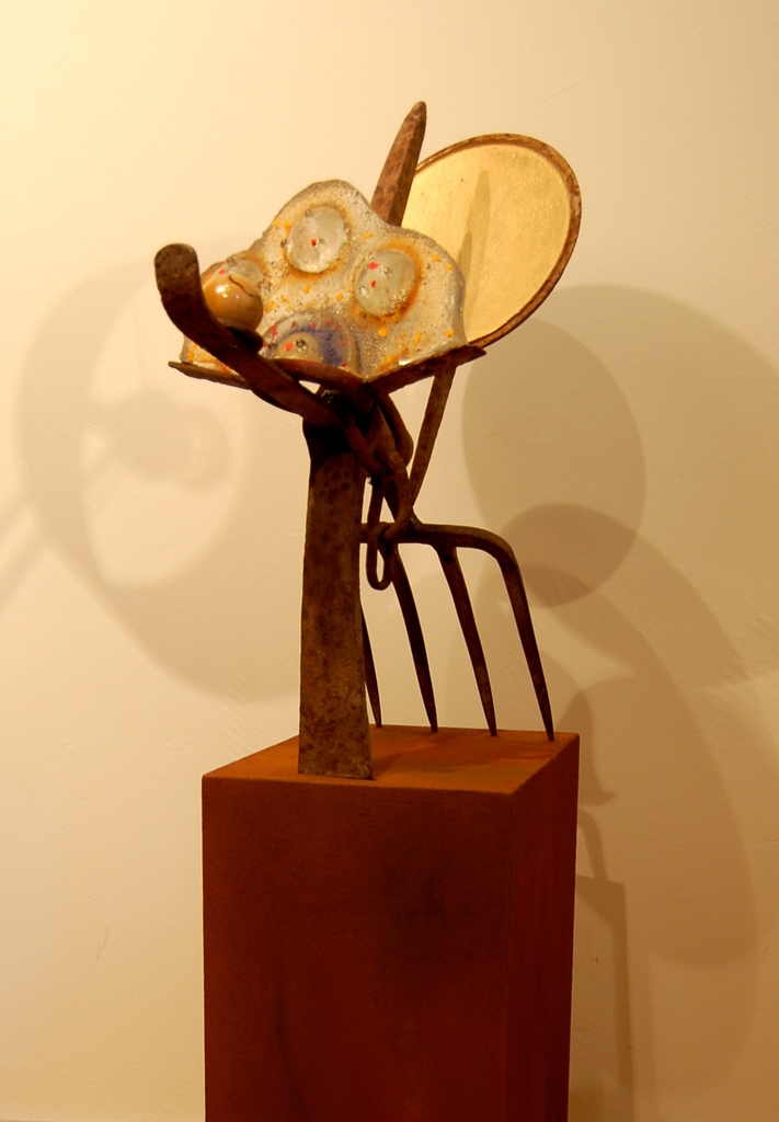 Gevonden gebruiks voorwerpen geasembleerd en met gegoten glas tot een werk versmolten.