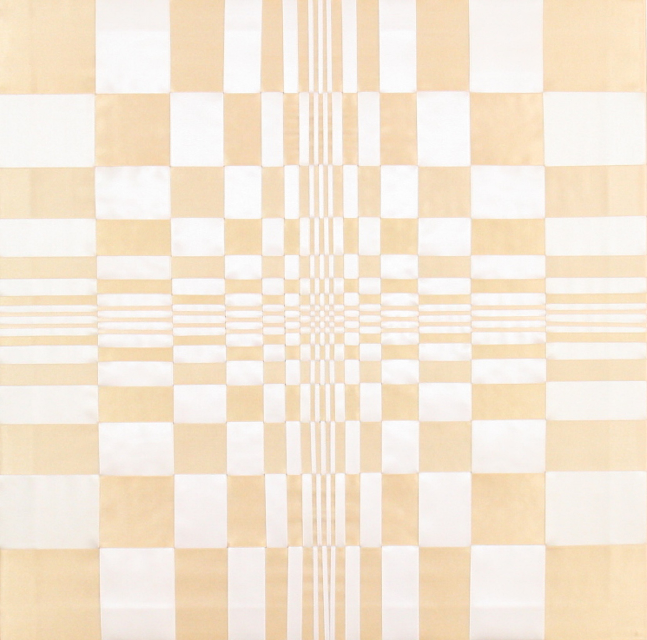 Lichtgeel met ecru vlechtwerk gevlochten met satijnlint en gespannen op een houten frame van 45 x 45 cm. Door met oplopende breedtes te werken lijkt er beweging in het werk te zijn en wordt je blik naar binnen gezogen.