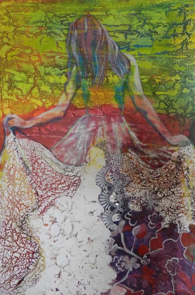 Ze neemt de ruimte, vult zich met aardse energie, en volgt haar eigen weg. Uitgewerkt in acryl mixed media op linnen.