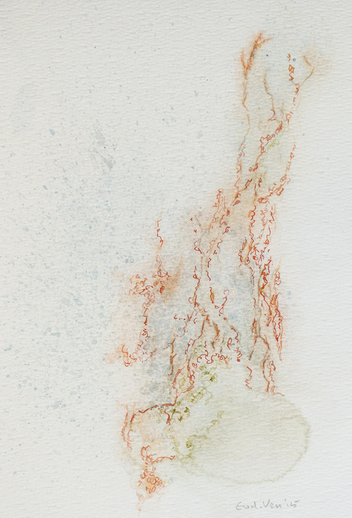 Schilderijen als wandelingen in een fictief landschap: natuurelementen die op elkaar inspelen, al dan niet met menselijke ingrepen.