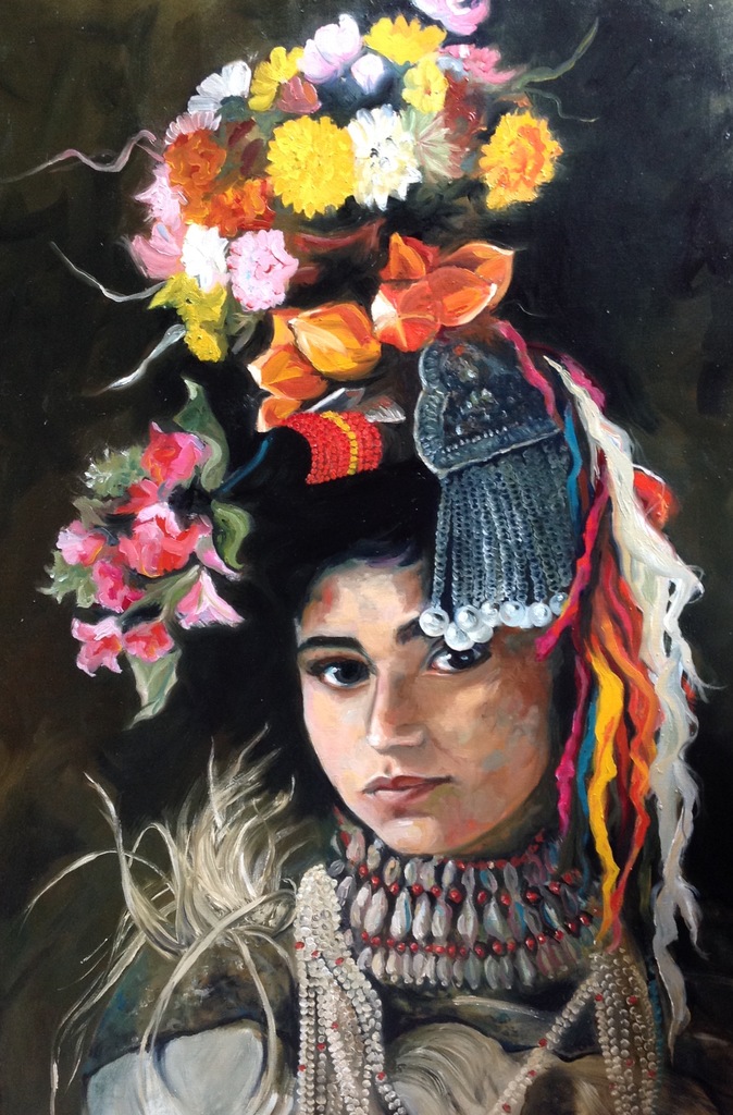 Vrouw uit Drokpastam, India/Pakistan . Geschilderd naar een foto van Jimmy Nelson.