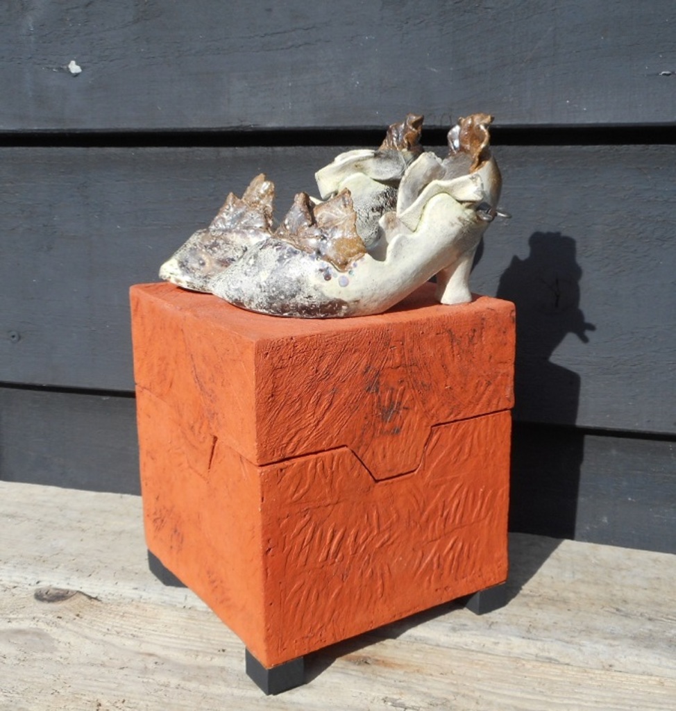 Schoenendoos in keramiek...handvorm...glazuur en oxyden.
