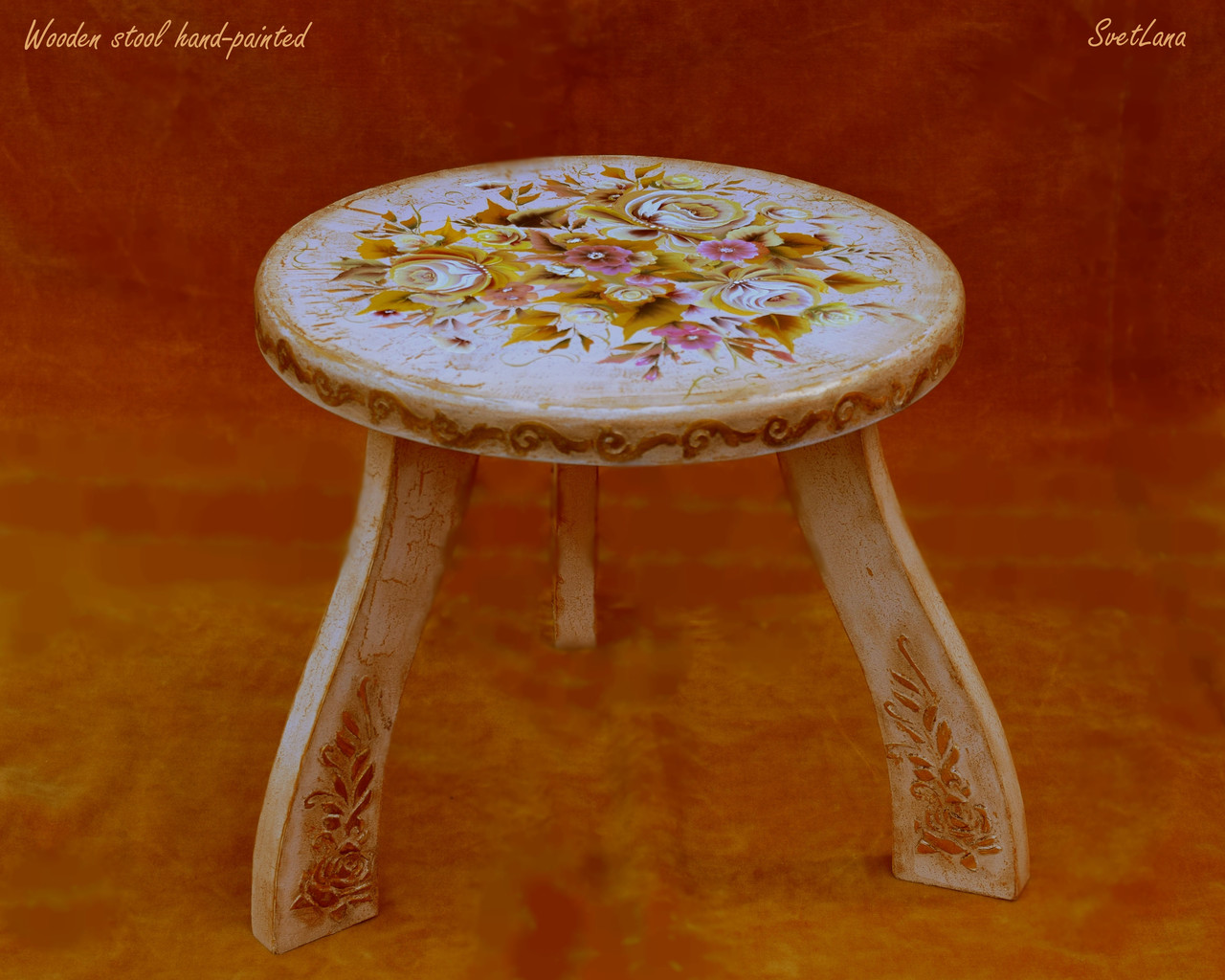 Decoratieve ronde houten stoel, handgeschilderd met acryl op de handgemaakte craquelure en gelakt met glanzend vernis. Diameter is 30 cm, Hoogte is 26 cm. Slechts één stuk gemaakt.