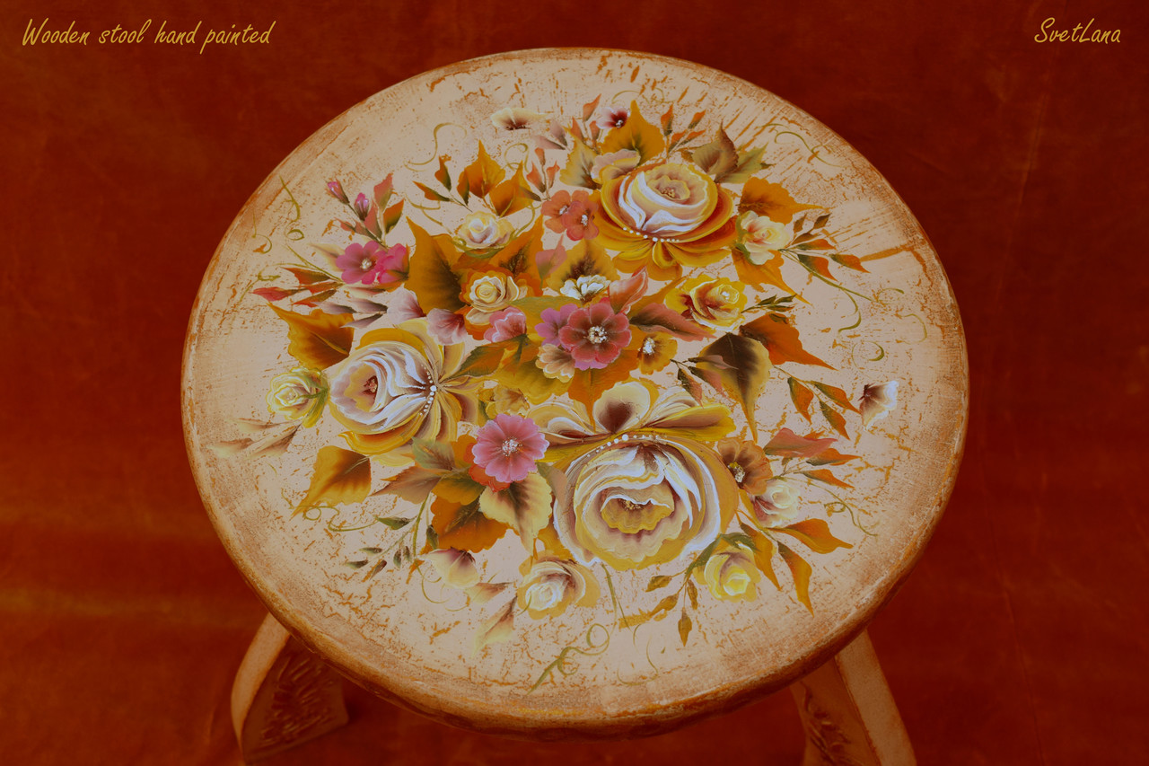 Decoratieve ronde houten stoel, handgeschilderd met acryl op de handgemaakte craquelure en gelakt met glanzend vernis. Diameter is 30 cm, Hoogte is 26 cm. Slechts één stuk gemaakt.