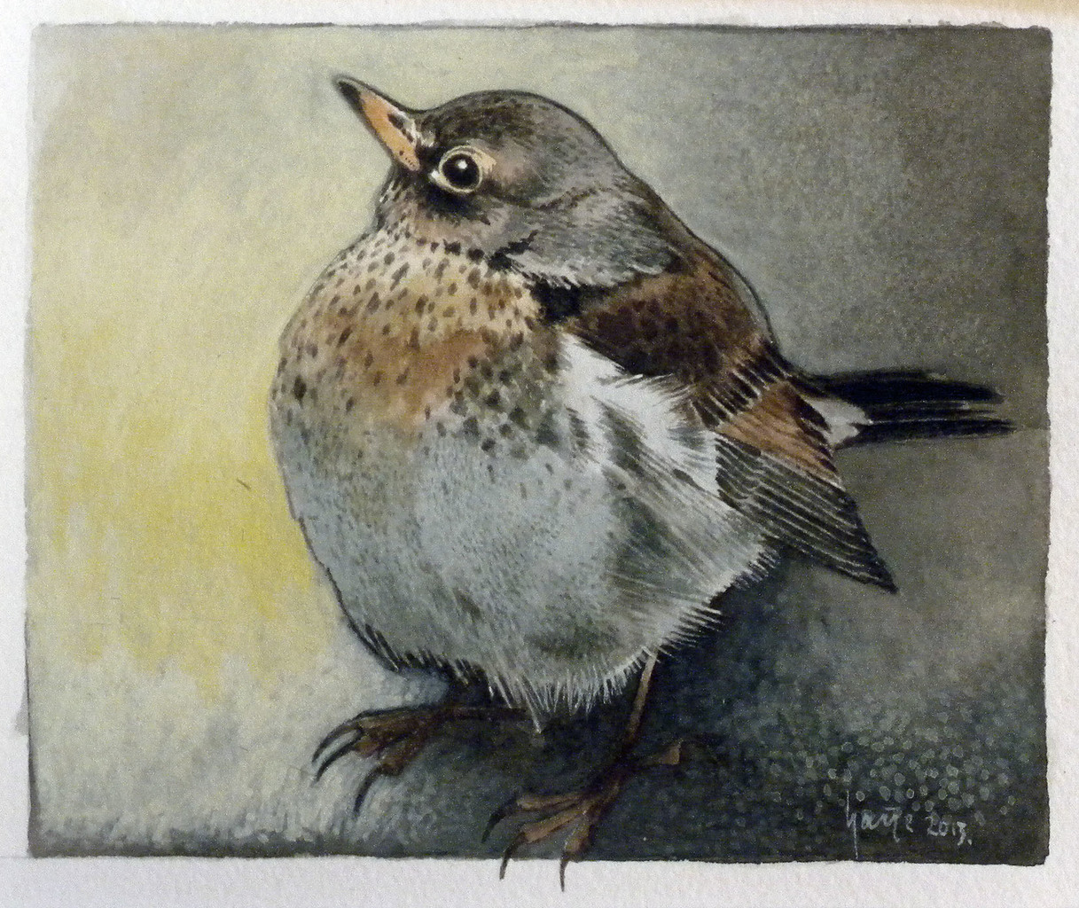 Klein formaat aquarel gehoogd met dekverf. De vogel kijkt naar links,. Bolle veren iv.m. de kou.