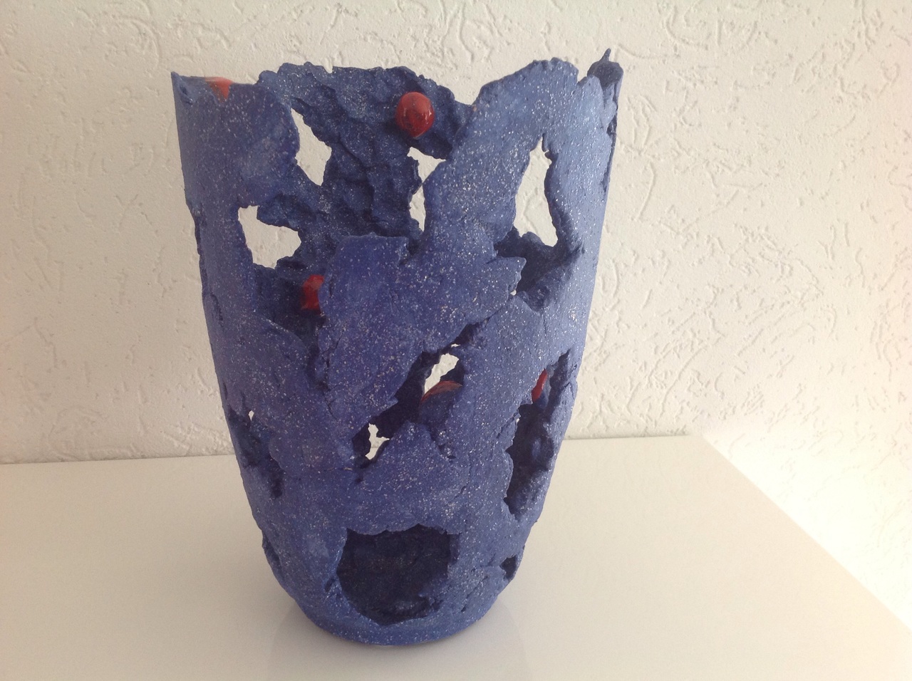 Open vaas met matte, blauwe glitter glazuur. Rode glanzende bolletjes aan de binnenkant.