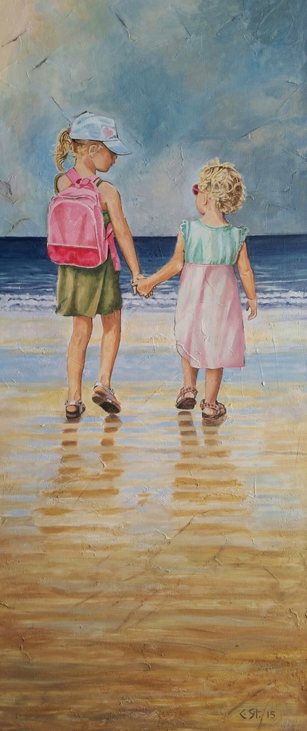Zee Strand Realistisch Olieverf Blauwe Zomer Petje Zusjes Hand In