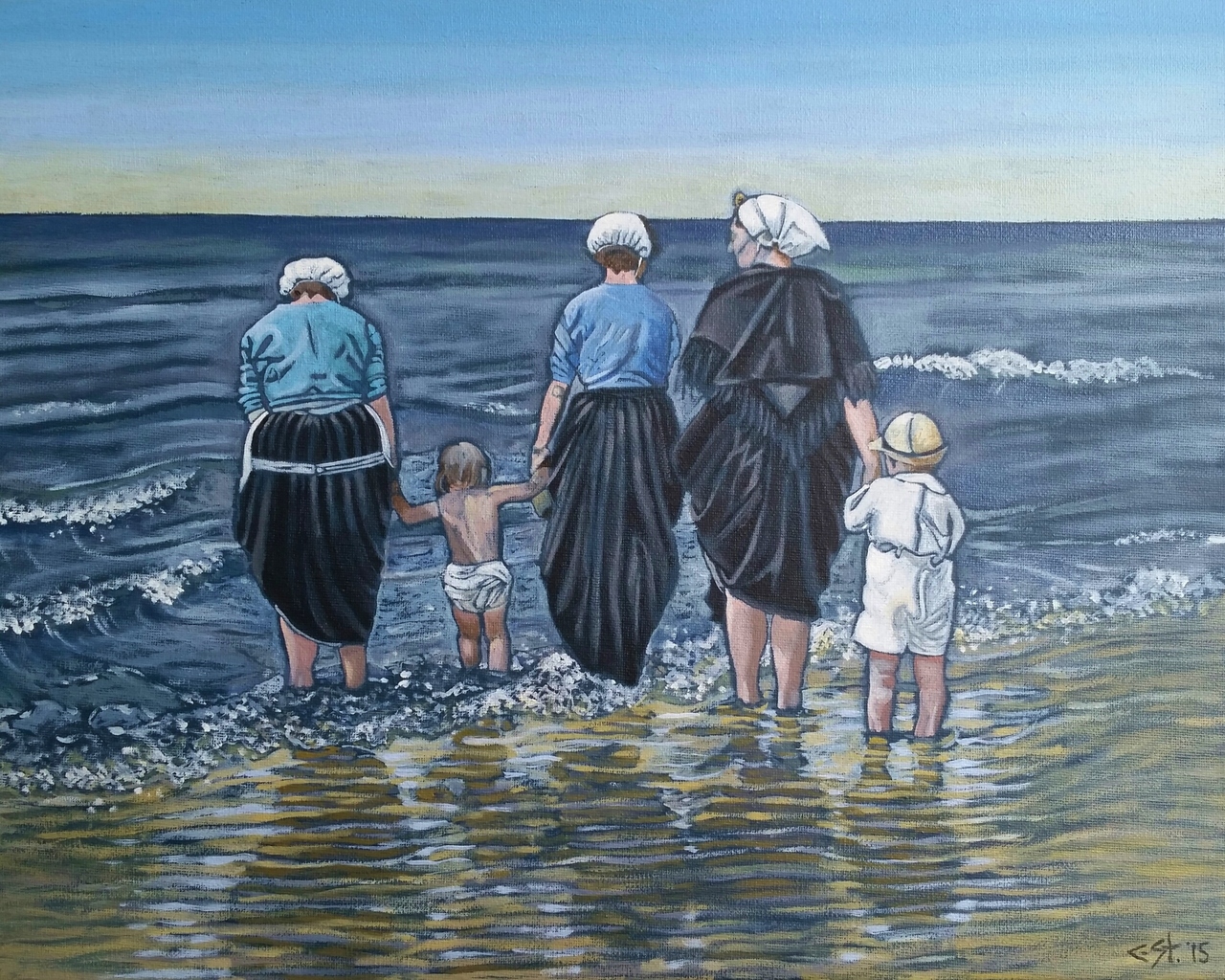Klederdracht Strand Zee Lucht Blauw Vrouwen Kinderen Olieverf Realistisch