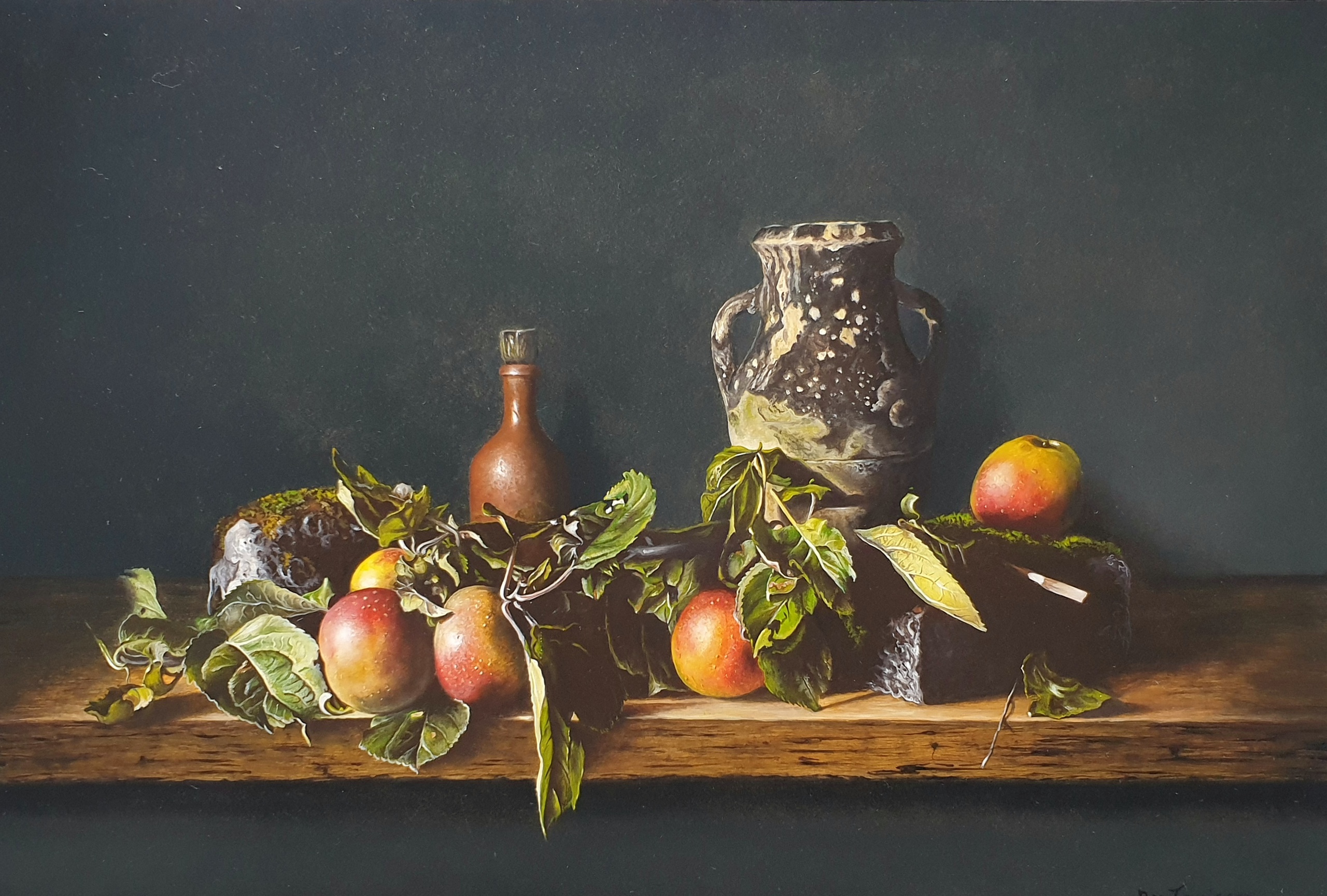 Stilleven met appels bemoste stenen en kruik