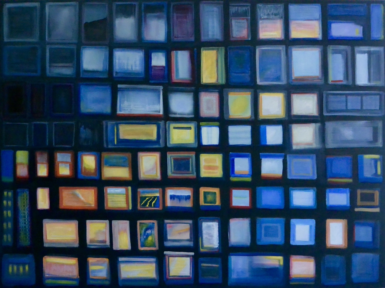 schilderij, olieverf op doek (90x 120) de vierde wand is een denkbeeldige scheiding tussen publiek en toneel, het schilderij is een verzameling van imagianaire voorstellingen van een vierde wand.