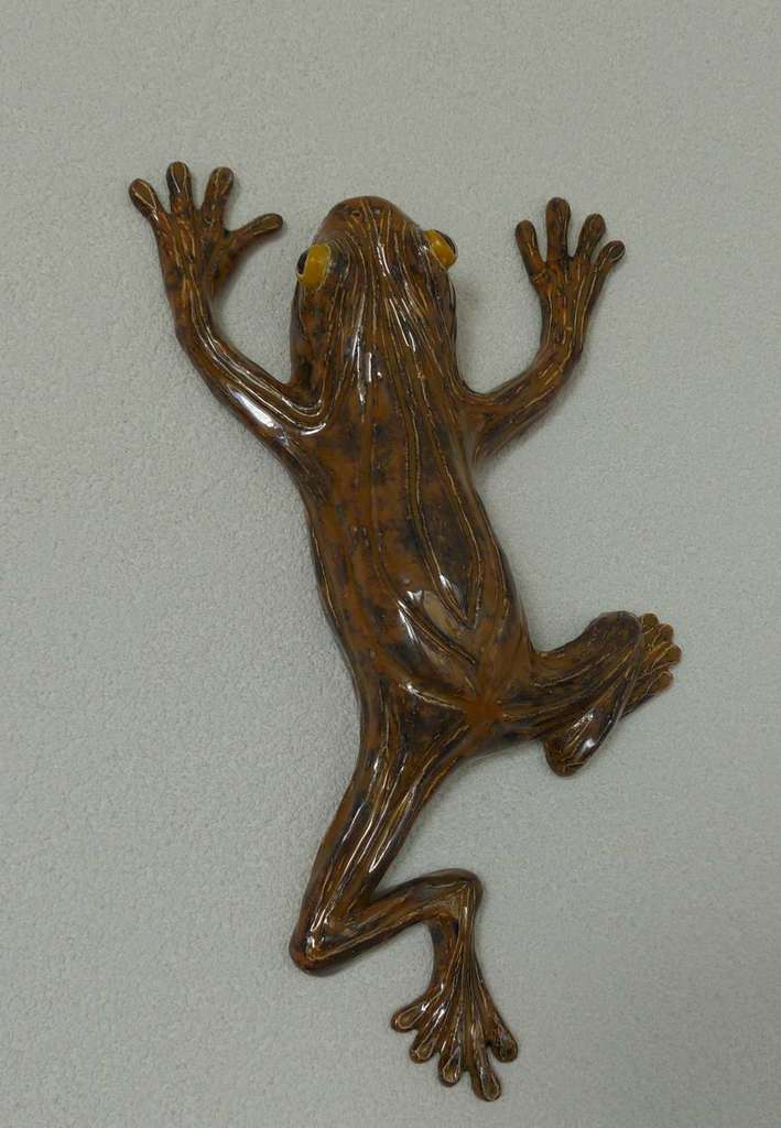 Decoratieve kikkers aan de wand.