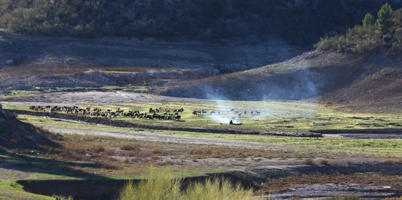 De kloof bij het stuwmeer waar een kleine rivier uitkomt blijft een permanente bron van inspiratie. Hier is het meer droog gevallen en een herder laat er zijn schapen grazen.