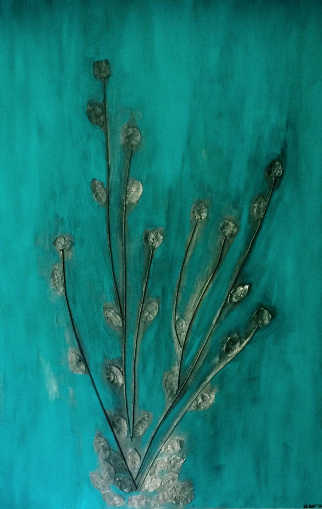 Dit kunstwerk is bewerkt met acryl, lege theelichthulzen en metalen krullen (slijpsels) in de vorm van een plant.