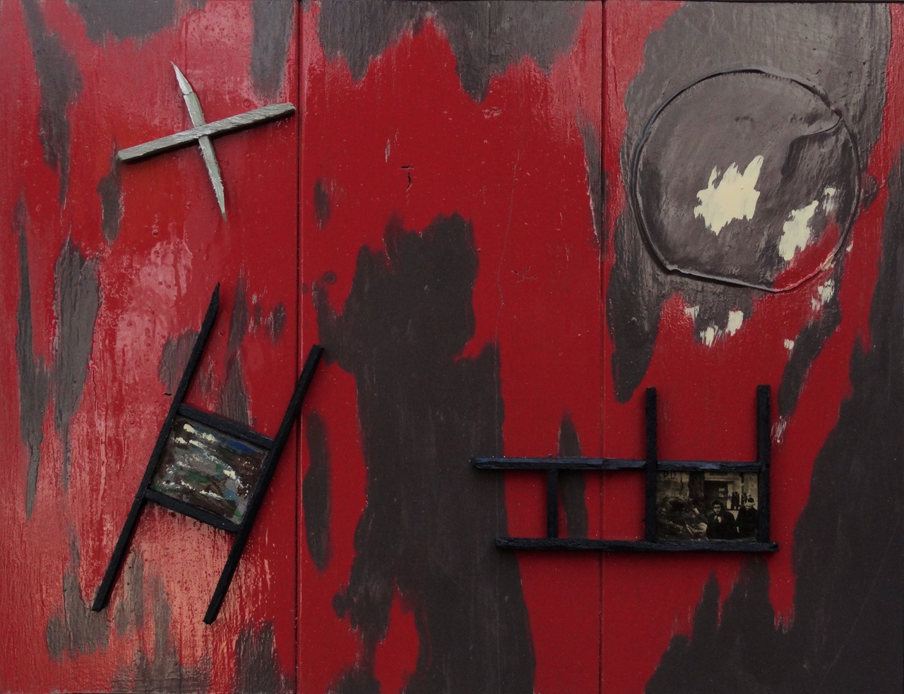 Grenzen scheiden / twee gebieden die zijn verbonden / in één zone. // Dag en nacht, beschenen door zon en maan / gegrepen door abstractie. (collage - assemblage, hout, stof, papier, verf)