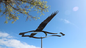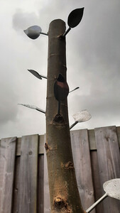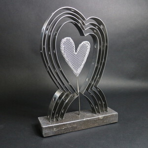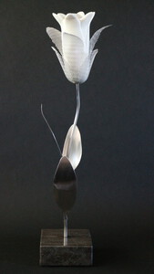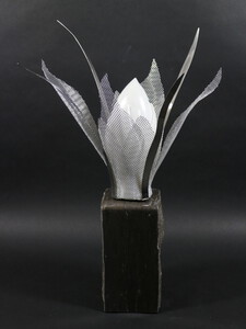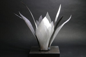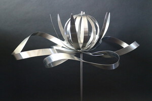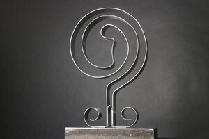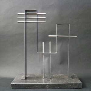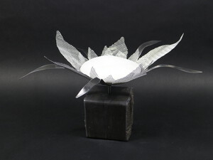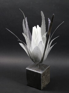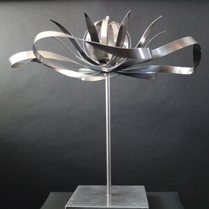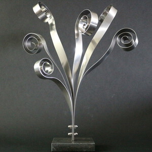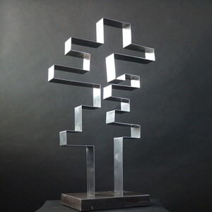 Sculptuur gemaakt van RVS strips. Bijeengehouden dmv RVS draadend, RVS buis en RVS moer en dopmoer. Gemonteerd op een hardstenen sokkel.