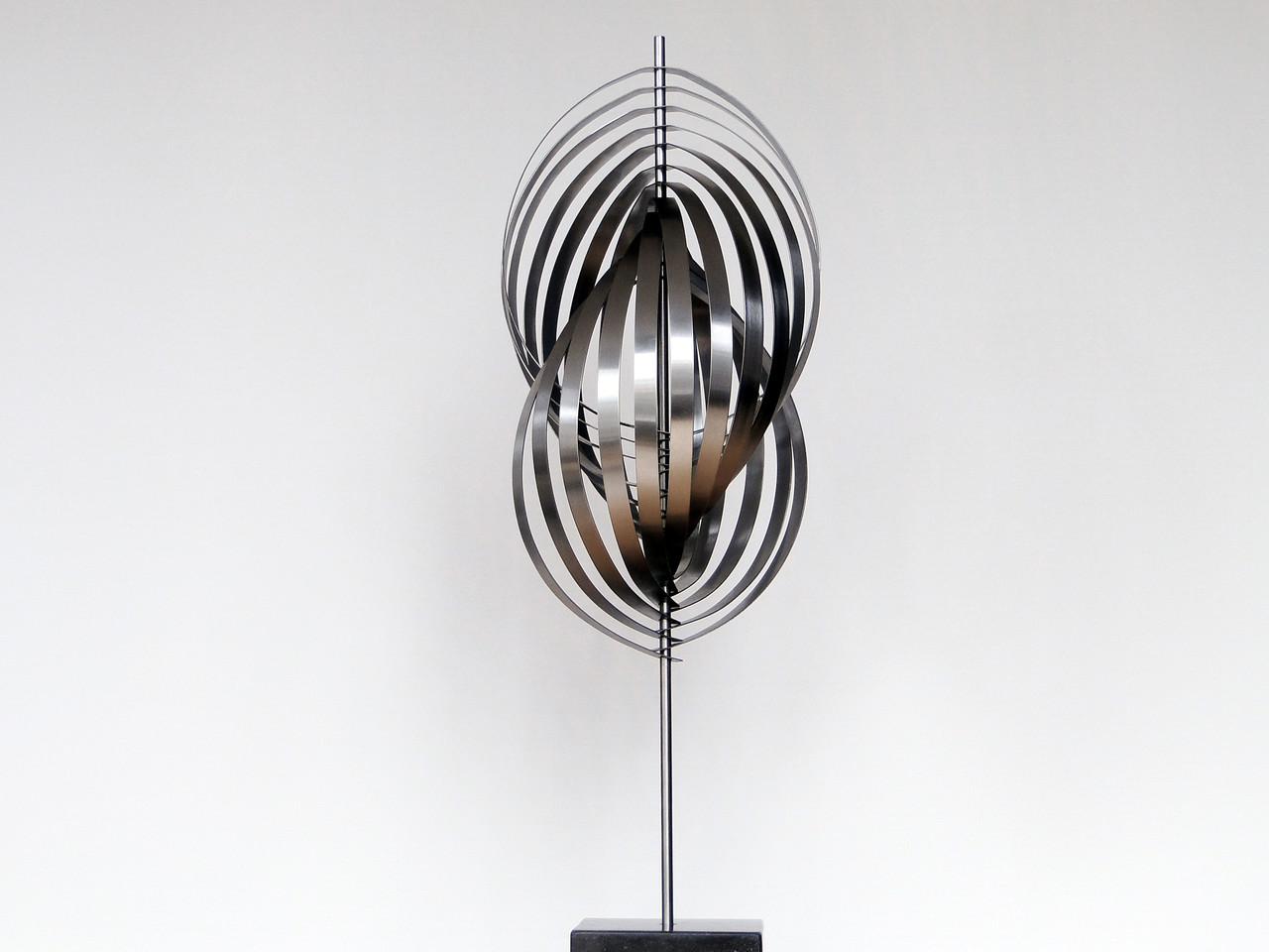 Sculptuur gemaakt van RVS strips. Bevestigd op een RVS stang en geplaatst op een hardstenen sokkel.