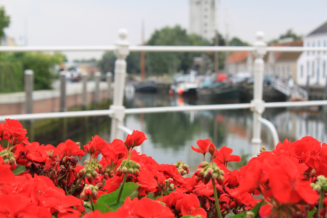 Bloemenbak aan gracht.