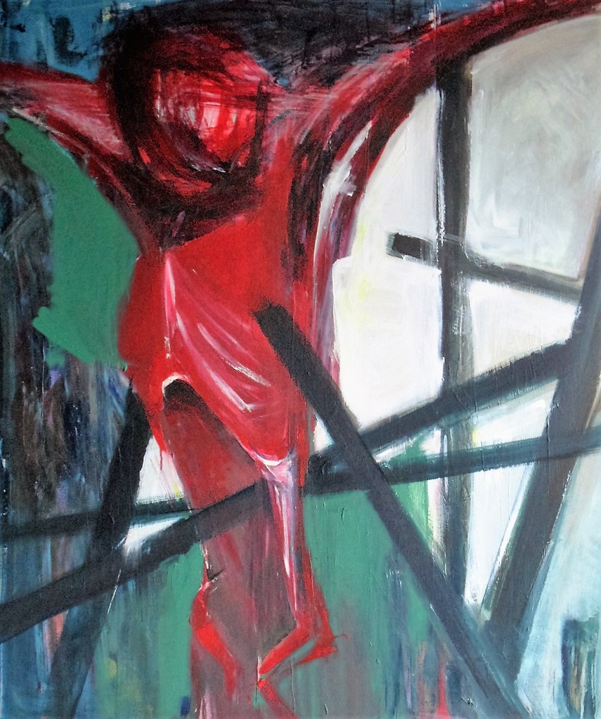 Mens Figuur Hangen Acryl Figuratief Abstract Expressie Rood Wit Blauw Zwart Groen Contrast